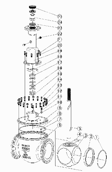 圖中數字注釋:1表示閥座墊片,2表示閥座,3表示閥體,4、10表示銷軸,5表示閥桿,6表示閥體,7表示閥蓋,8表示墊片,9表示閥蓋,11表示活接螺栓,12、14、21表示螺母,13、20表示螺柱,15比保濕填料墊,16表示填料,17表示填料壓蓋,18表示壓板,19表示支架,22表示導向螺釘,23表示推力球軸承,24表示閥桿螺母,25表示軸承壓蓋。