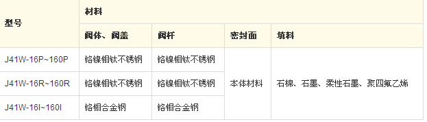J41W型PN16~PN160不銹鋼截止閥:手動、法蘭連接、直通式、閥座密封面材料為 0Cr18Ni9 系不銹鋼(J41W-16P~160P)、0Cr17Ni12Mo2 系不銹鋼(J41W-16R~160R)、1Cr5Mo 鉻鉬鋼(J41W-16I~160I),公稱壓力 PN16~PN160,閥體材料為 0Cr18Ni9 系不銹鋼(J41W-16P~160P)、0Cr17Ni12Mo2 系不銹鋼(J41W-16R~160R)、1Cr5Mo 鉻鉬鋼(J41W-16I~160I)的截止閥。