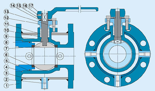 圖中數字解析:1表示閥體,2表示連接口,3表示夾套,4表示鎖緊螺母,5表示O型圈,6表示密封圈,7表示球體,8表示閥桿,9表示墊片,10表示填料墊,11表示填料,12表示填料壓蓋,13表示螺釘,14表示定位片,15表示擋圈,16表示螺釘,17表示手柄。